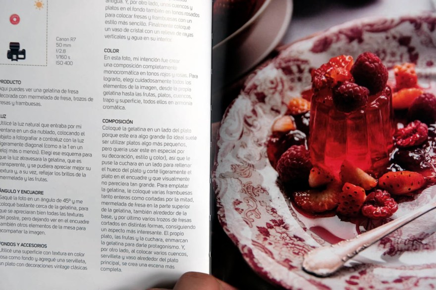 Sobre el resto de puntos, se habla de fondos, accesorios, colores y composiciones, con explicaciones no demasiado largas, muy claras, concisas, muy comprensibles y de fácil aplicación práctica. De hecho, podría decirse que es un libro que anima -y lo hace la autora desde sus primeras páginas- a no solo leerlo sino a mirar de aplicar todo lo explicado y a ‘pelearse’ con cada composición para tratar de alcanzar el objetivo deseado y que, en fotografía de comida, suele ser despertar emociones que inviten a provar lo que se ve en pantalla. Buena, por lo tanto, obra, que se lee en poco tiempo, de peso ligero y que es ideal para llevar siempre encima, en cualquier sesión, para revisar conceptos, ideas o temas que lo requieran.